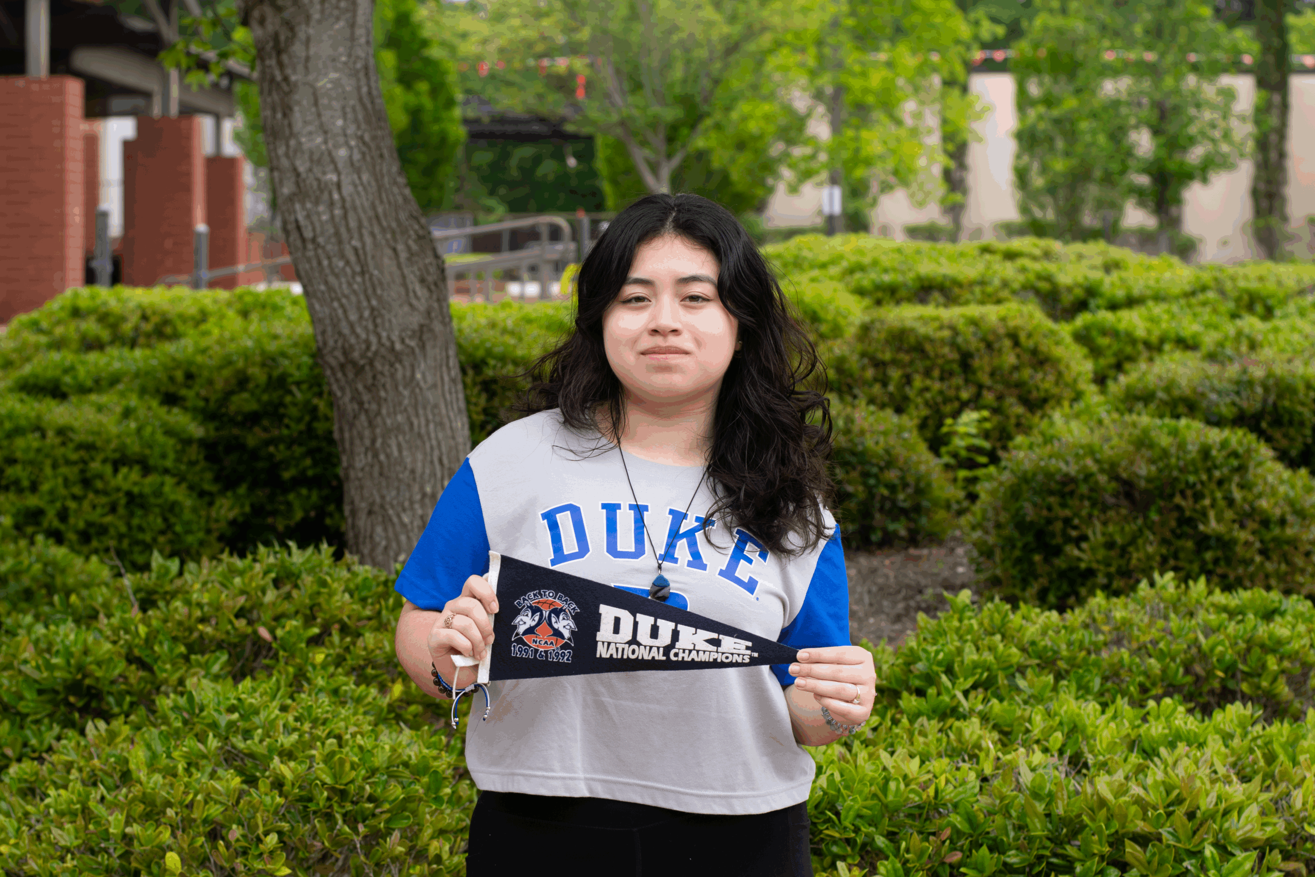 Senior Genesis Rodriguez-Hernandez poses for a photo with her QuestBridge college match Duke University. Photo by Eva Lucero.