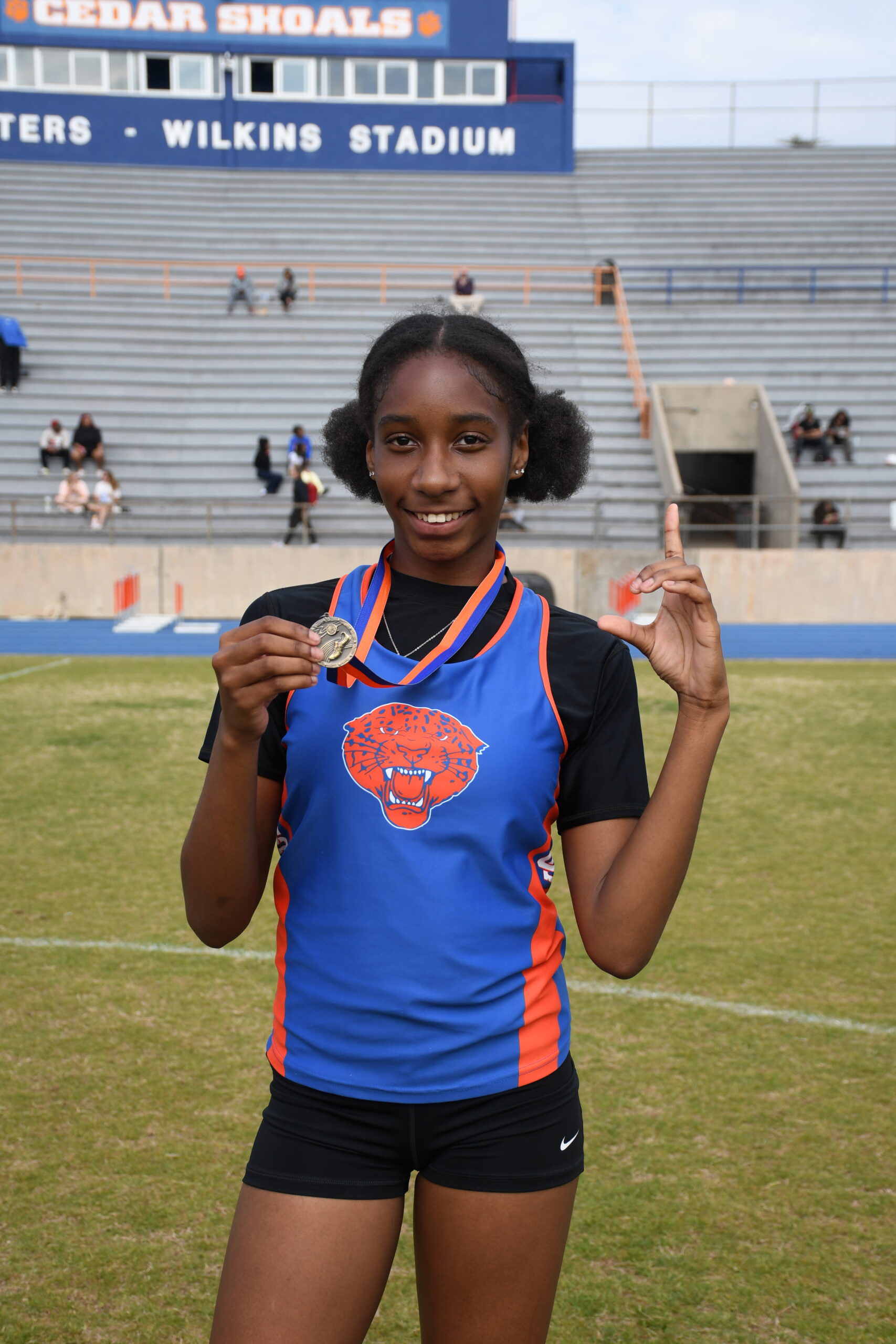 WINNING WILLIS: Anisa Willis poses after winning a medal at home on Cedar Shoals track field. One thing that inspires her to win during the meets is the sense of accomplishment she feels after making others happy. “Seeing other people smile for something that I’ve accomplished makes my heart smile, so for them to smile at something I´ve done feels rewarding,” Willis said. Photo by Reece Rodriguez.