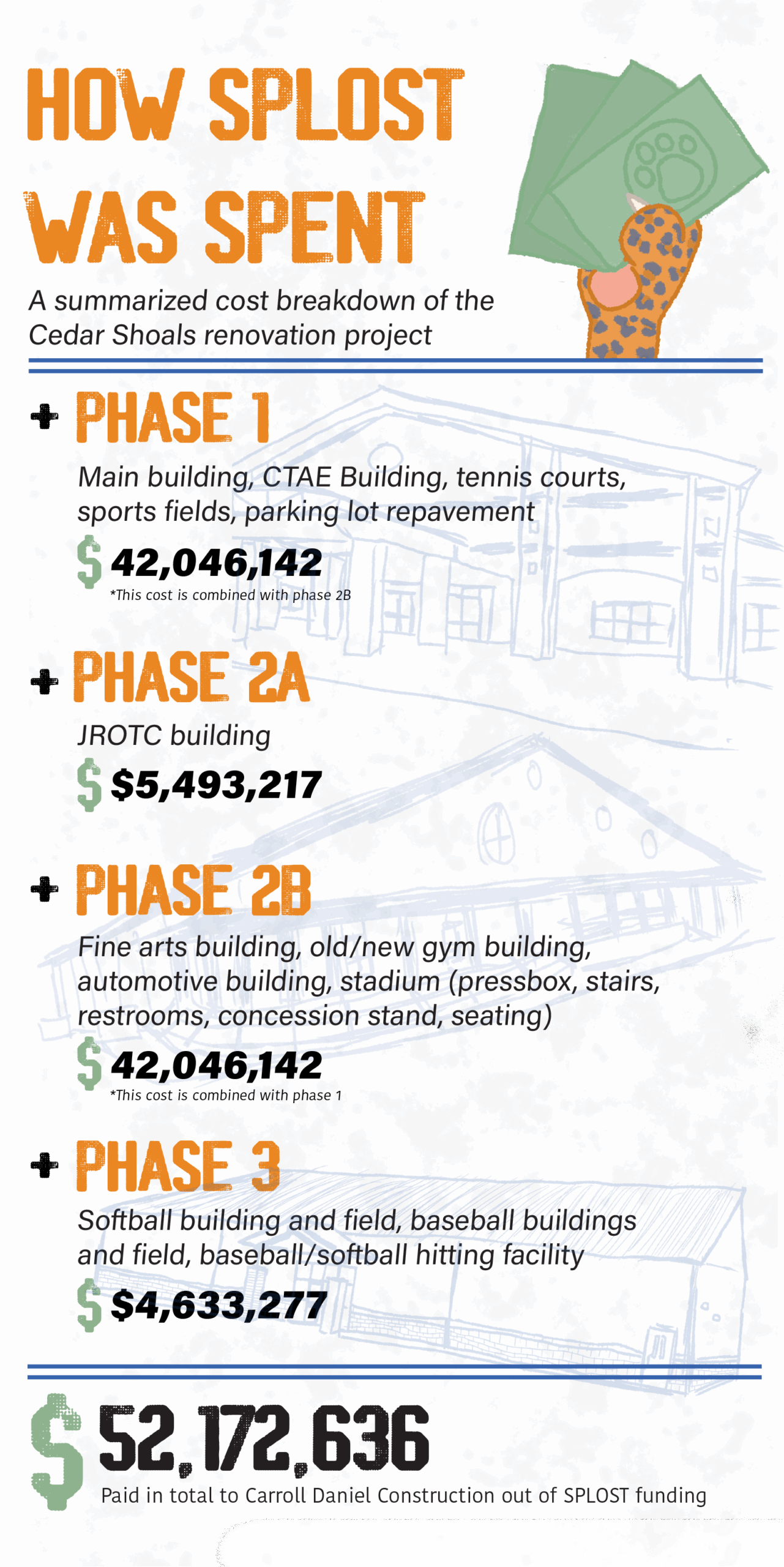 ADDING IT UP: An infographic shows a math equation adding together the phases of the Cedar Shoals’ renovation project with their corresponding costs. Each phase shows a summary of what was covered, with the total cost as a sum at the bottom. The final sum excludes the $4,900,000 reimbursement from the state of Georgia in Capital Outlay money. Information from Troy Bassett, Project Manager for CCSD’s SPLOST department. Infographic by Aislynn Chau.