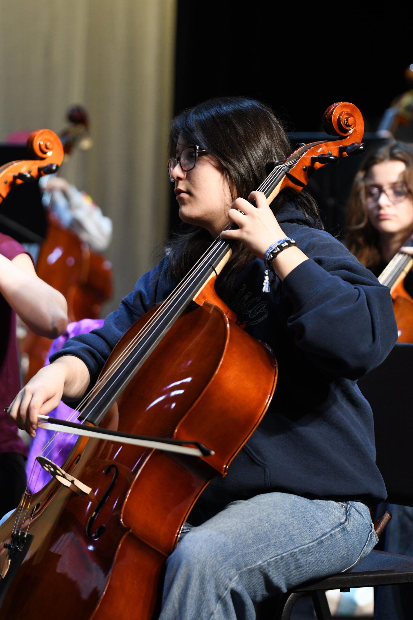 CONCENTRATED CELLIST: Junior cellist Rosibel Barcenas-Ramirez preforms with the concert orchestra during a class rehearsal on the stage. In order to prepare for the concert, the orchestra classes has been rehearsing in the auditorium to learn how the sound performs in the stage setting. Orchestra teacher Ryan Lopez feels the on-stage practices are necessary to best prepare for concerts. “As we are approaching our concert, we are on the stage, so we can get used to stage sound, not orchestra room sound, so that makes things really fun,” Lopez said. Photo by Gretta Garrett.