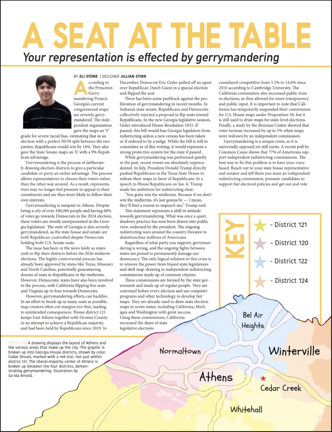 Gerrymandering is rampant in Athens. Despite being a city of over 100,000 people and having 68% of votes go toward Democrats in the 2024 election, these voters are mostly unrepresented in the Georgia legislature. The state of Georgia is also severely gerrymandered, as the state House and Senate are both Republican-controlled despite Democrats holding both U.S. Senate seats.