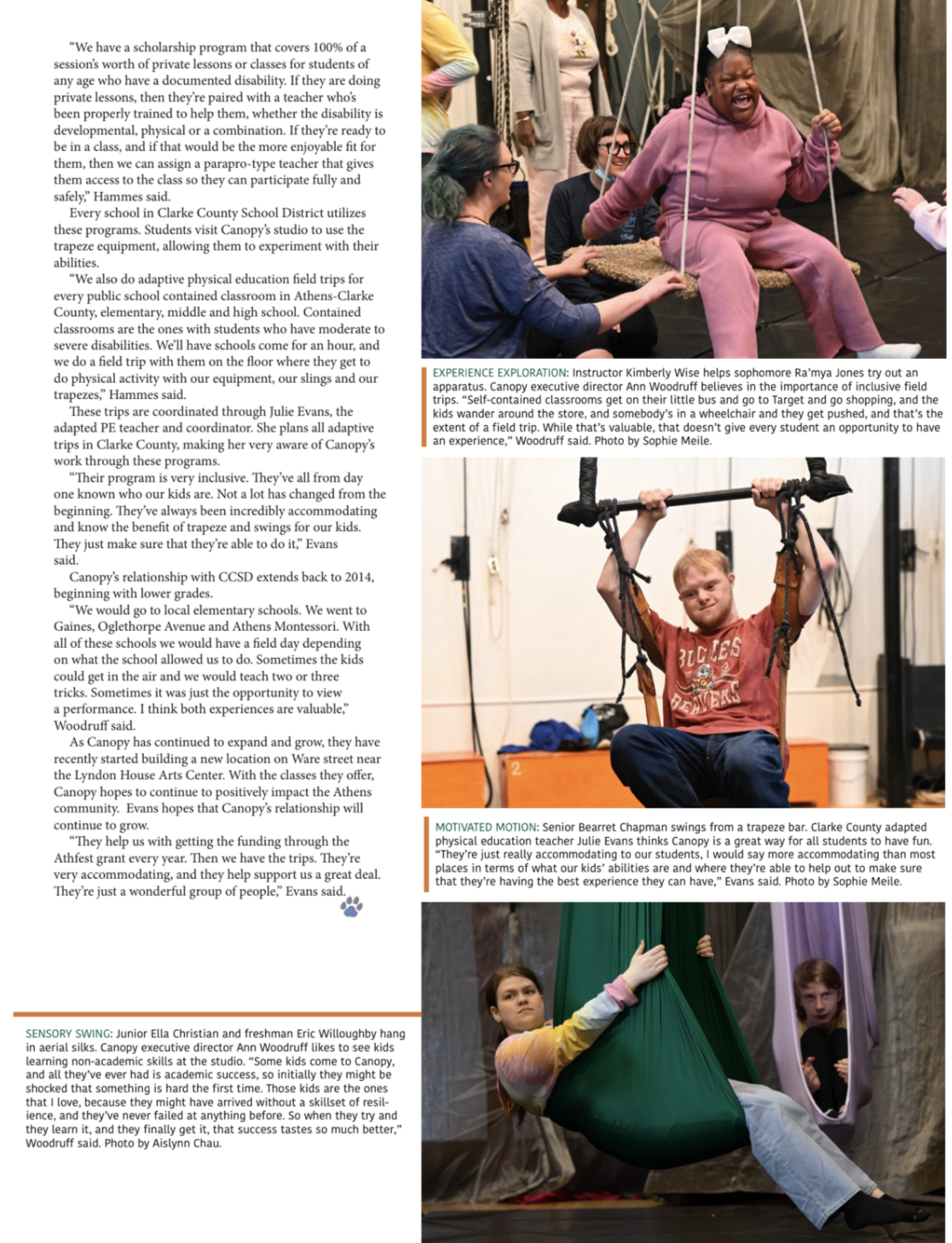 Every school in Clarke County School District utilizes these programs. Students visit Canopy’s studio to use the trapeze equipment, allowing them to experiment with their abilities.